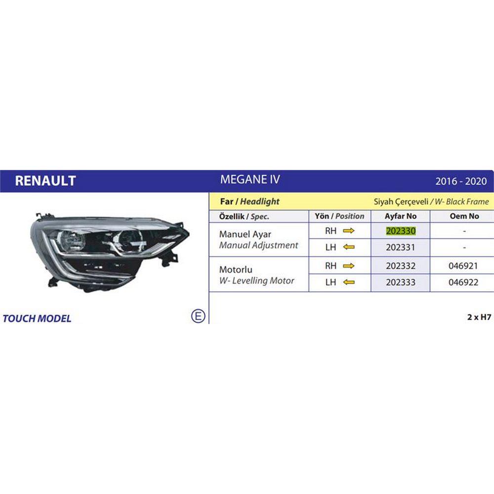 ON FAR SAG MEGANE IV TOUCH SIYAH CERCEVELI 16>20 MOTORLU