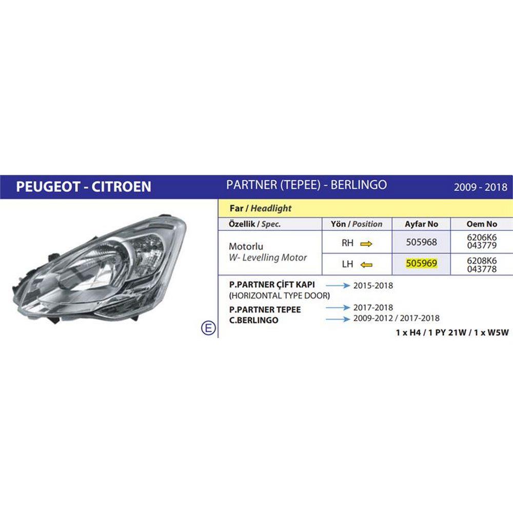 FAR+SINYAL SOL ELEKTRIKLI MOTORLU E BELGELI (H4) BERLINGO III (08>12)